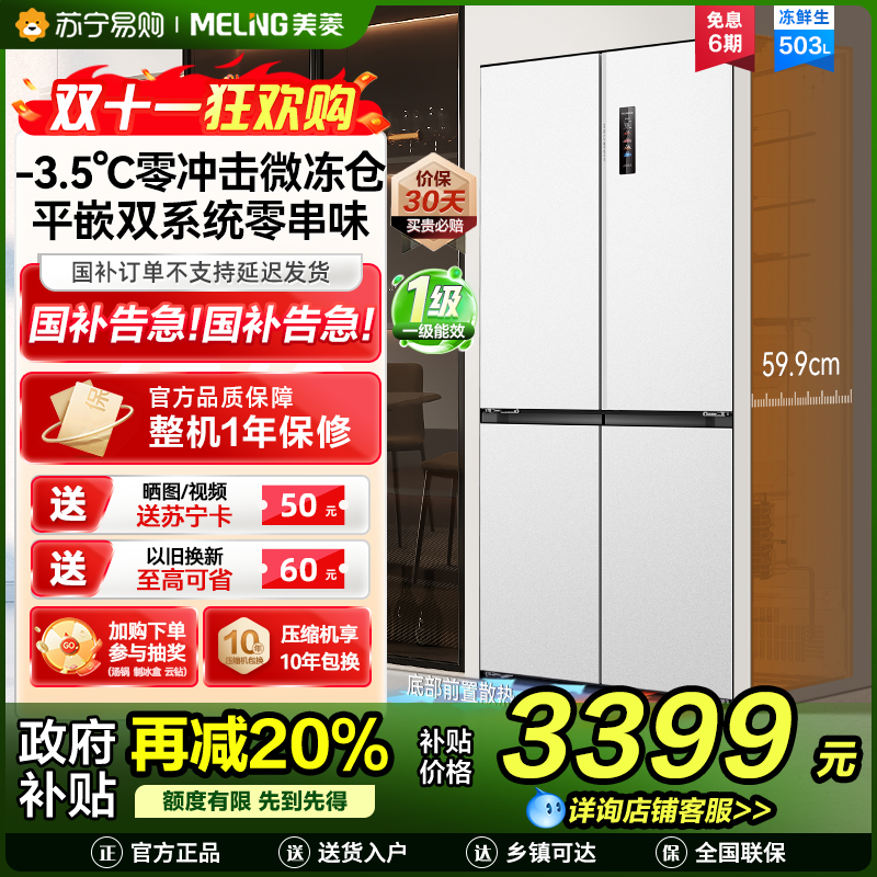 美菱(MeiLing)AI冰箱503十字四门对开门59.9cm深双系统零平嵌超薄除菌除病毒保鲜大容量一级省电冰箱国家补贴