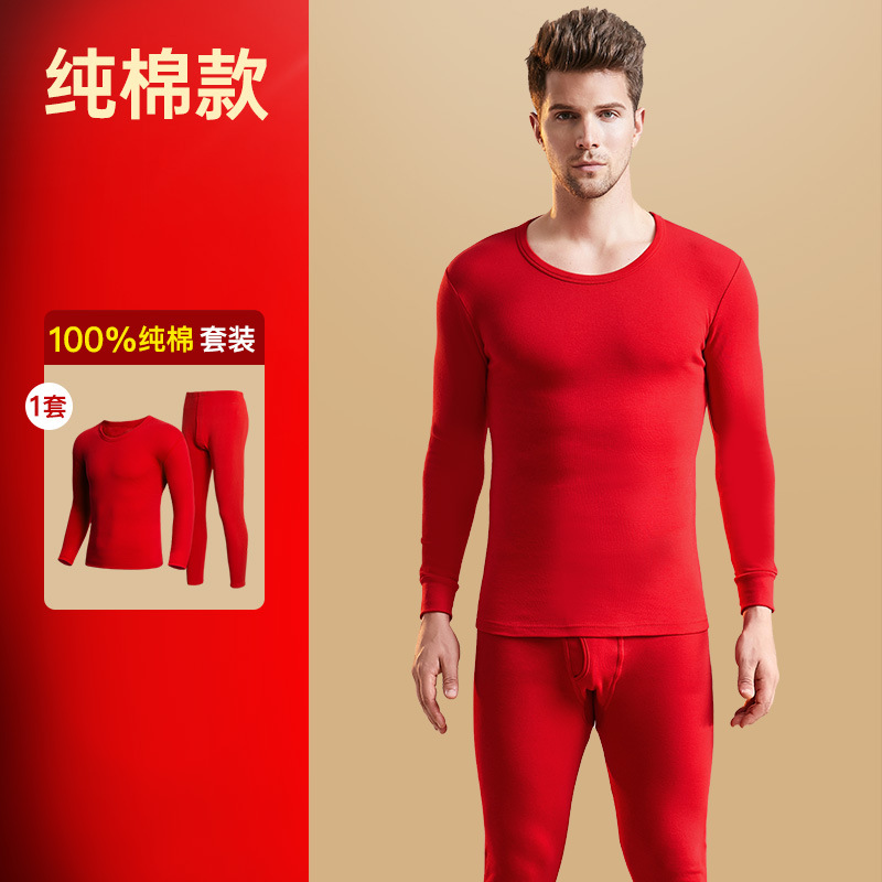 恒源祥虎年本命年套装大红色结婚女男士保暖内衣纯棉秋衣秋裤属虎_940 170(L) 男士纯棉内衣套装(圆领)