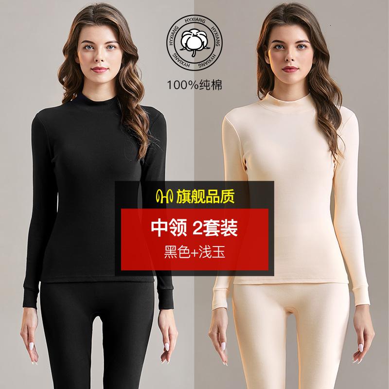 恒源祥女士内衣纯棉冬季薄款保暖内衣秋衣秋裤套装打底棉毛衫_438_279_835 XL(175/100) 黑色+浅玉【中领纯棉抗菌2套】