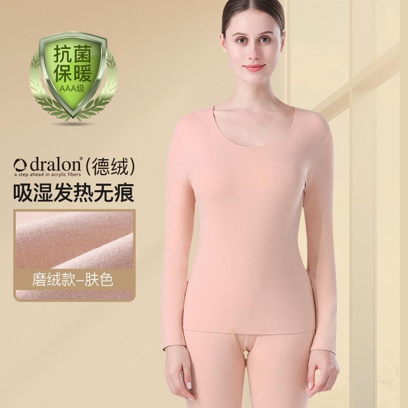 恒源祥保暖内衣女士打底衫德绒修身无痕保暖秋内衣秋裤套装秋冬季_474 175/XL 圆领f肤色一套