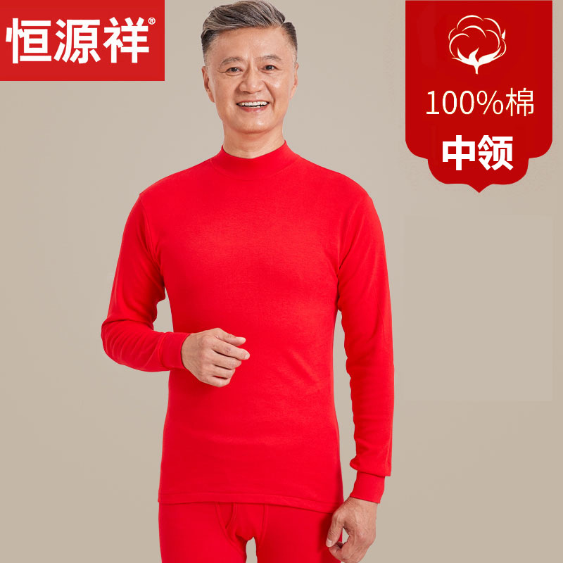 恒源祥本命年保暖内衣套装女大红色纯棉秋衣秋裤男中老年人棉毛衫_78 M(165) 男士-中领【恒源祥正品】