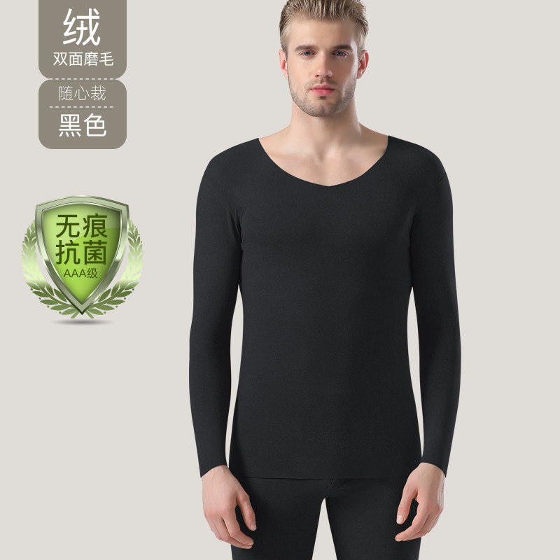 恒源祥男士秋衣春秋款保暖内衣加绒单件内穿上身无痕打底上衣冬季_126_47 165/M 【V领套装】黑色