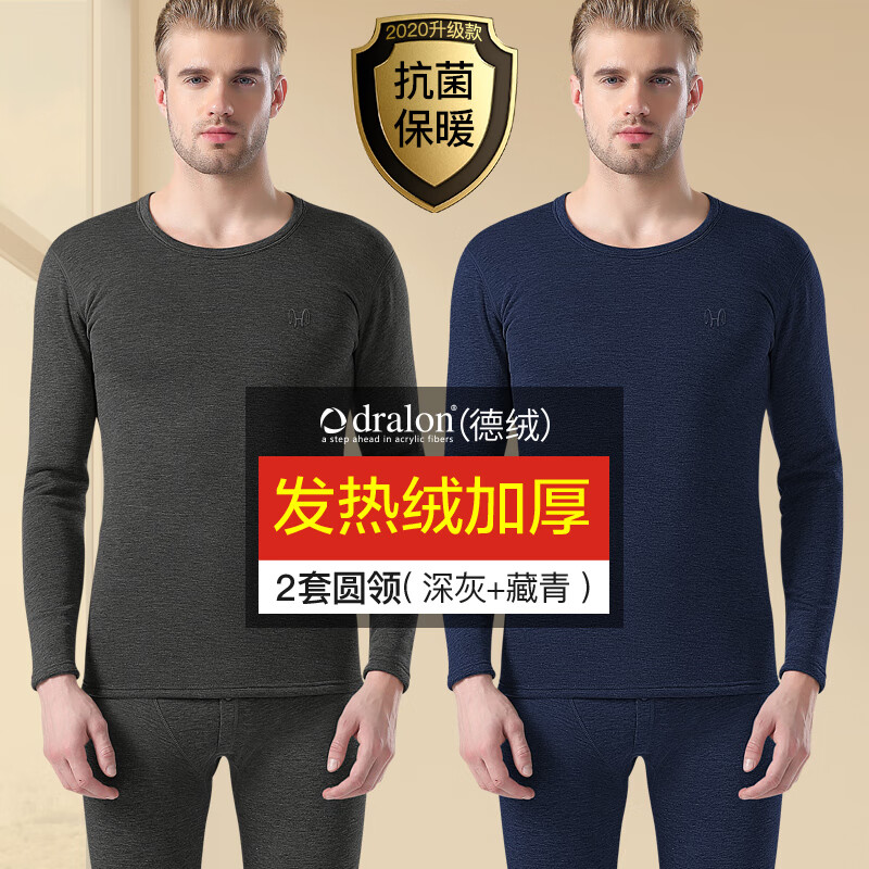 恒源祥男士套装加绒加厚德绒锁温保暖内衣纯棉秋冬季抗寒防风男款_494_164 175(XL) 2套装圆领【德绒加厚】深灰色+藏