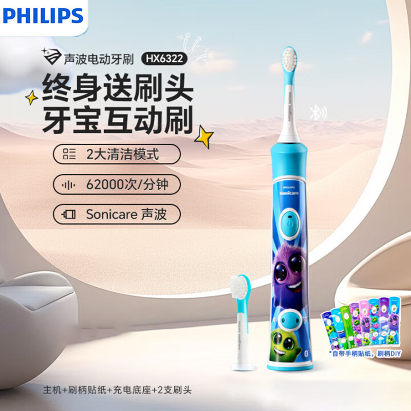 飞利浦(PHILIPS)儿童电动牙刷4-6岁-12岁宝宝小孩子软毛自动牙刷声波震动 蓝牙APP互动版HX6322/04 HX6322儿童款
