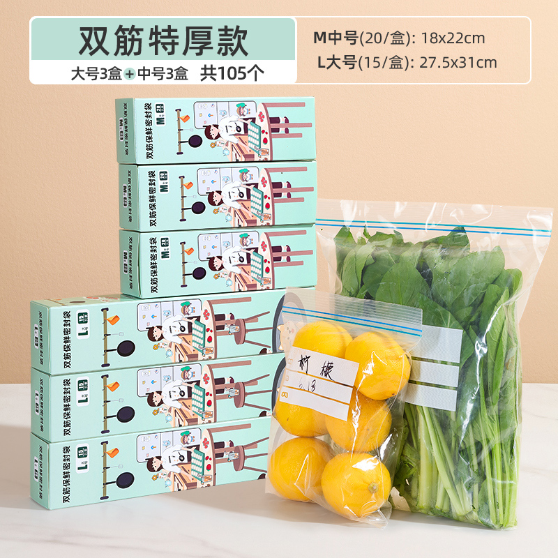 密封袋食品级保鲜袋家用自封塑封加厚冰箱收纳冷藏专用分装带封袋 超值套装双筋特厚款共105个3大+3中