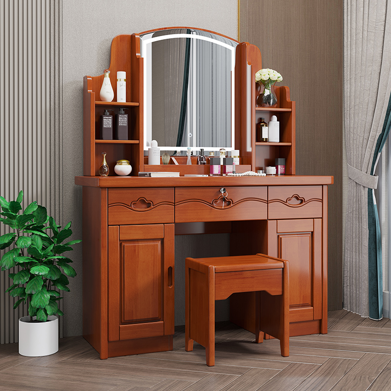 青木川 中式实木梳妆台斗柜主卧室房间带灯2023新款小型网红多功能床边化妆桌雕花化妆柜简约现代化妆桌 海棠色【不带灯】