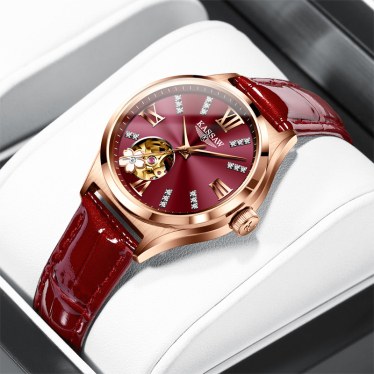 卡梭(KASSAW)手表女自动机械表女士真钻时尚潮流防水新款樱花女表K990L 酒红色