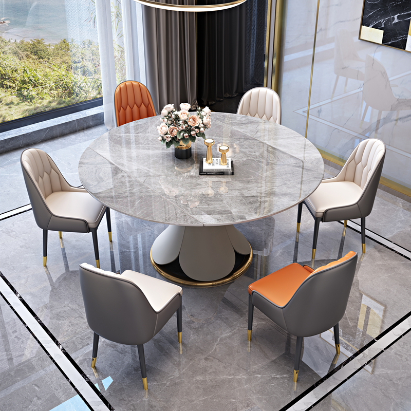 青木川 意式轻奢餐桌椅组合圆桌小户型可伸缩折叠1.2米1.5M吃饭桌子餐厅客厅多功能两用家用铁艺圆形岩板餐桌餐椅组合套装 一桌6椅【1.35米长】 岩板纹理备注