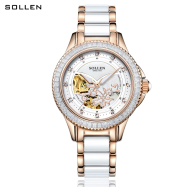 梭伦(SOLLEN)手表女陶瓷自动机械女表时尚休闲商务潮流防水镶钻真皮带生活防水手表LS402 402玫瑰金白面