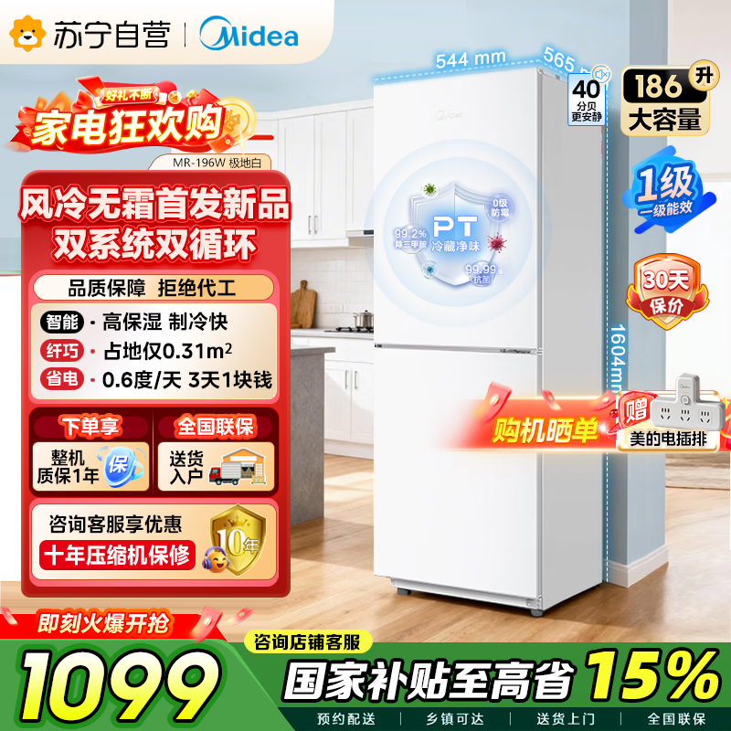 美的冰箱极地白196双门电冰箱MR-196W 1级能效186升大容量独立式节能低音电脑控温三星级冷冻 节能省电 以旧换新