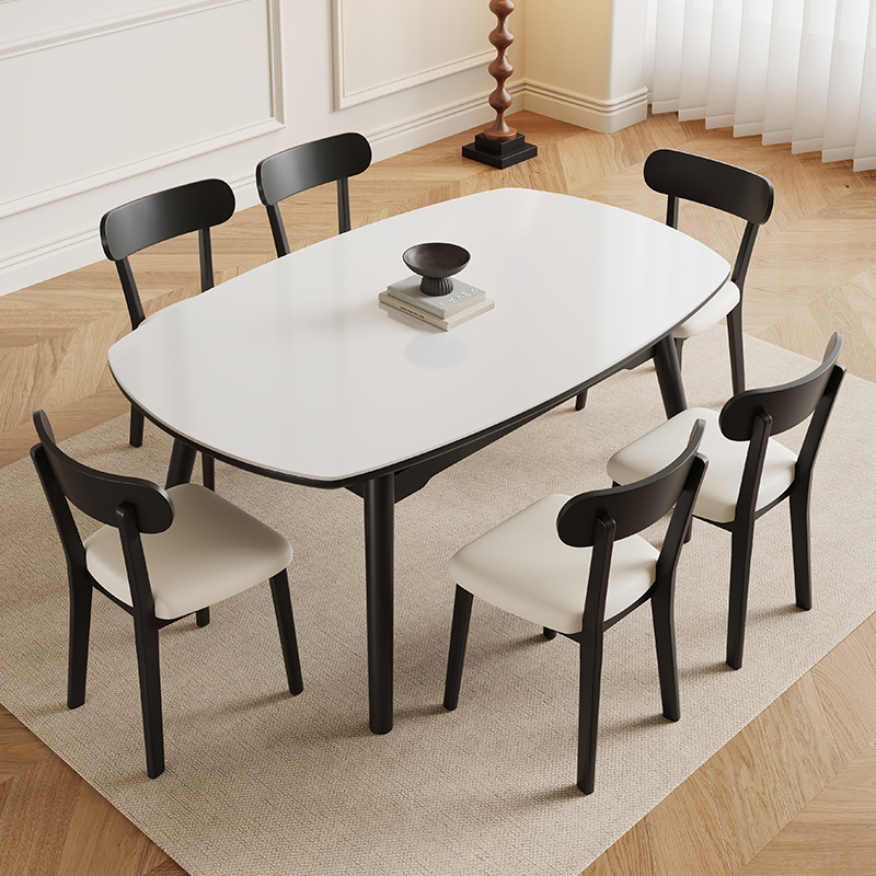 青木川 简约现代实木餐桌椅组合家用客厅小户型伸缩方圆可变圆桌两用多功能岩板餐桌椅组合吃饭桌子奶油风 黑色椅子 1.3米餐桌+6椅