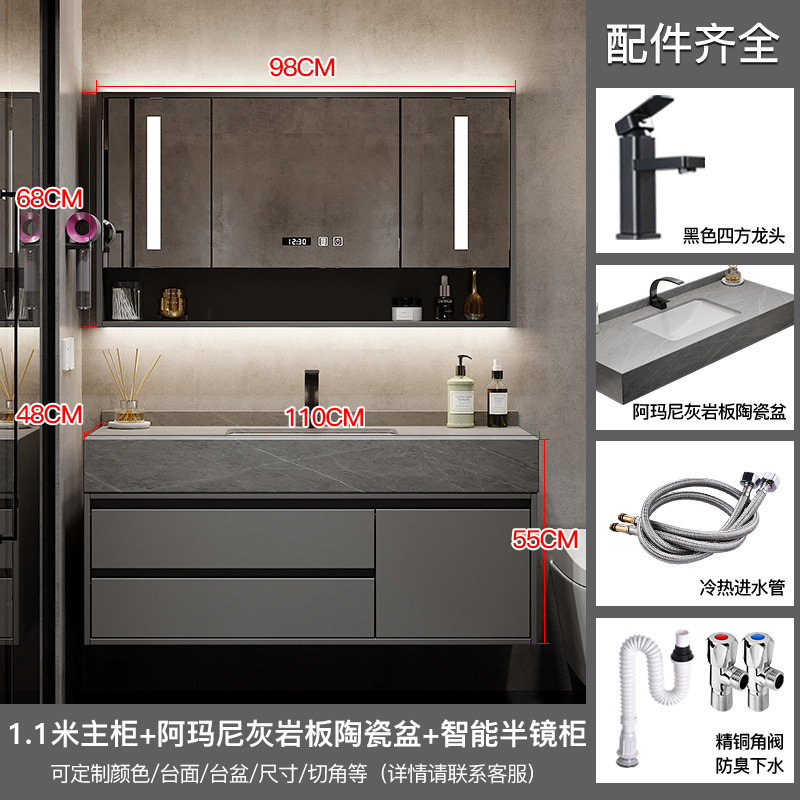 汉德斯科实木浴室柜组合套装岩板一体陶瓷盆吊柜挂墙式智能镜柜简约现代卫浴柜卫生间洗漱台洗脸盆洗手盆柜组合 110cm智能镜柜款 入户送安装