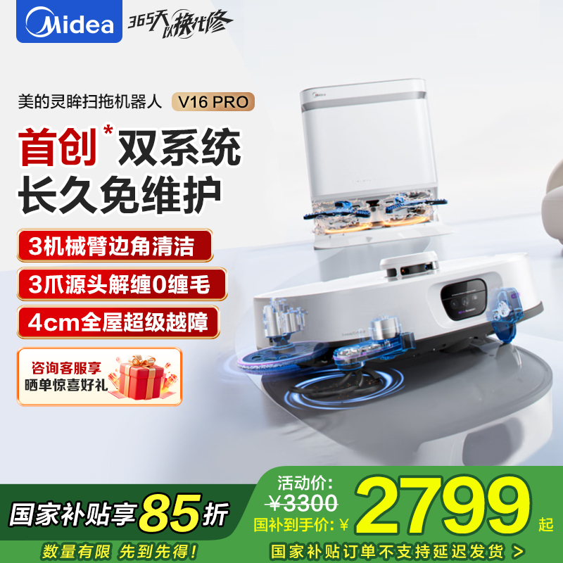 美的扫地机器人AI双目感知系统 强吸力22KPa 越障4cm 3爪防缠系统 飓风洗烘 8重健康抑菌 V16Pro水箱版