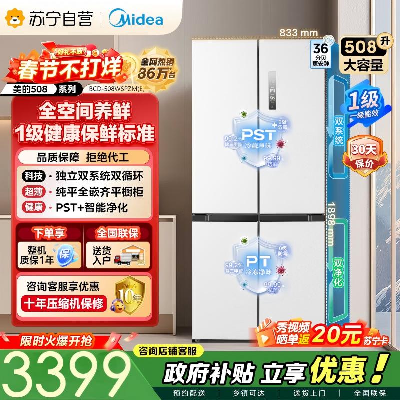 [自营]美的冰箱508升十字对开门双系统双循环一级能效除菌净味大容量冰箱BCD-508WSPZM(E)海贝白