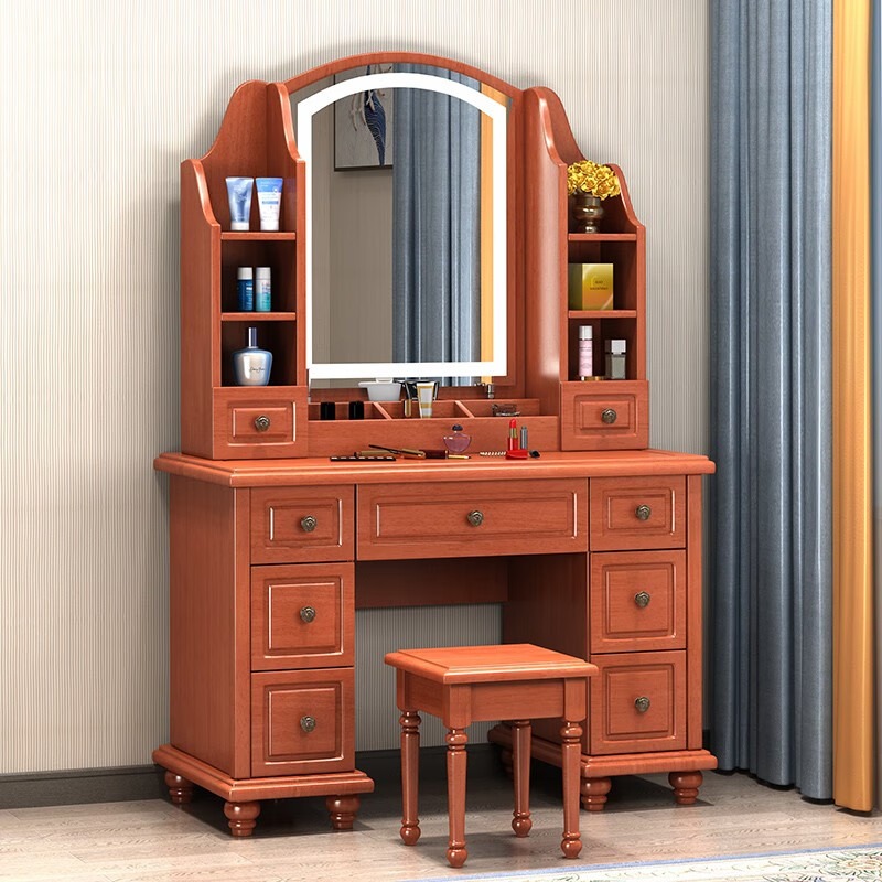 青木川 实木梳妆台卧室房间家用一米影楼化妆台收纳柜一体女生网红ins风田园美式白色化妆桌带灯简约现代 B款带灯妆台【海棠色】