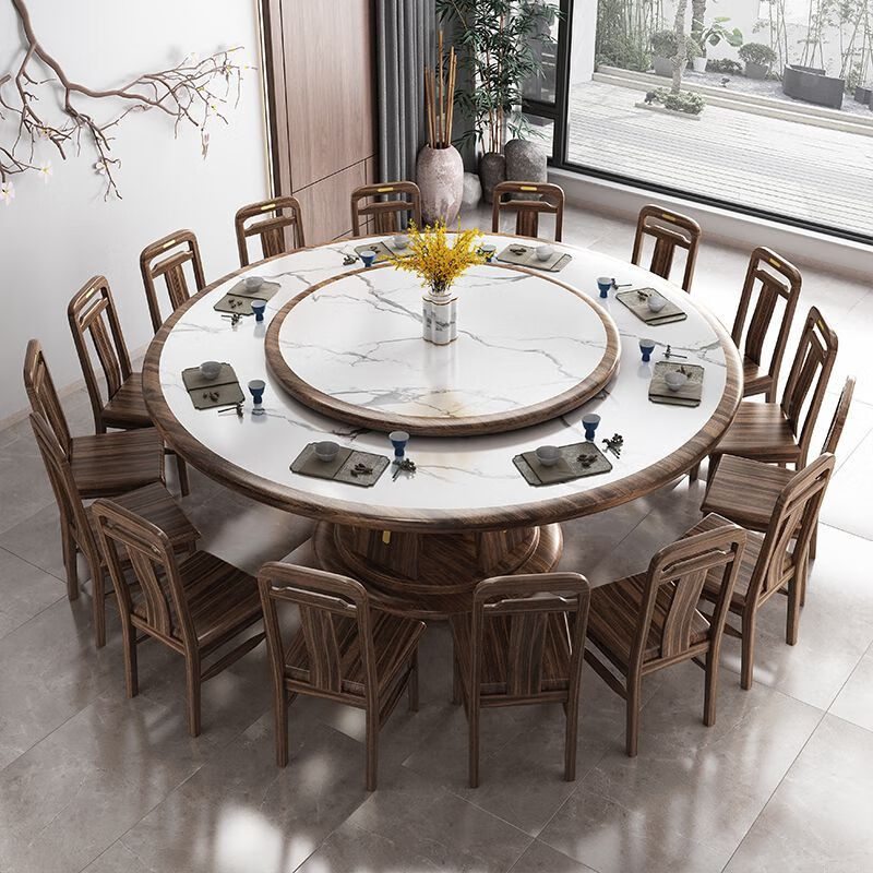 青木川 简约现代实木餐桌椅组合客厅餐厅家用小户型带转盘圆桌微晶石圆形吃饭桌子 1.6米圆桌+8张八角椅 黑檀色