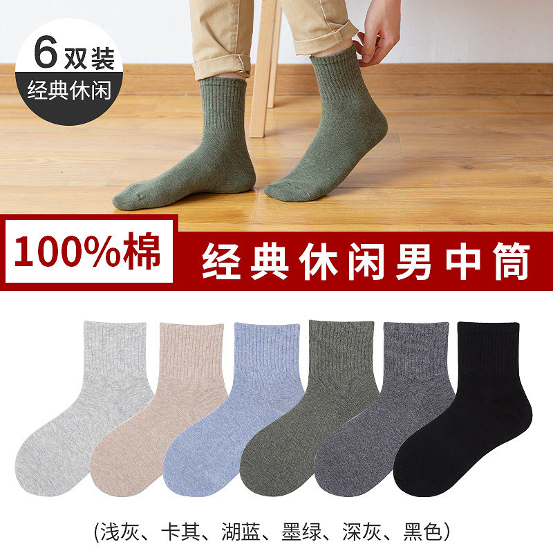 恒源祥袜子男士纯棉春秋季薄款吸汗透气运动中筒长袜全棉袜潮_448 白色/浅灰/卡其/军绿/深灰/黑色 均码【100%纯棉AAA抗菌】