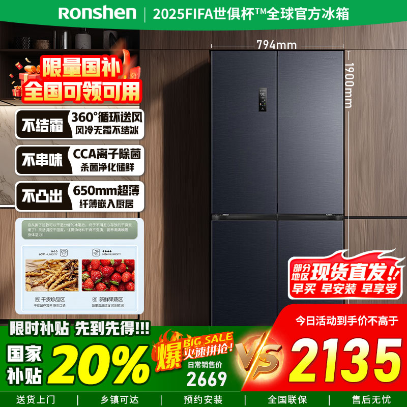 容声(Ronshen)620L十字对开四门变频冰箱变频超薄风冷无霜大容量冰箱一级能效