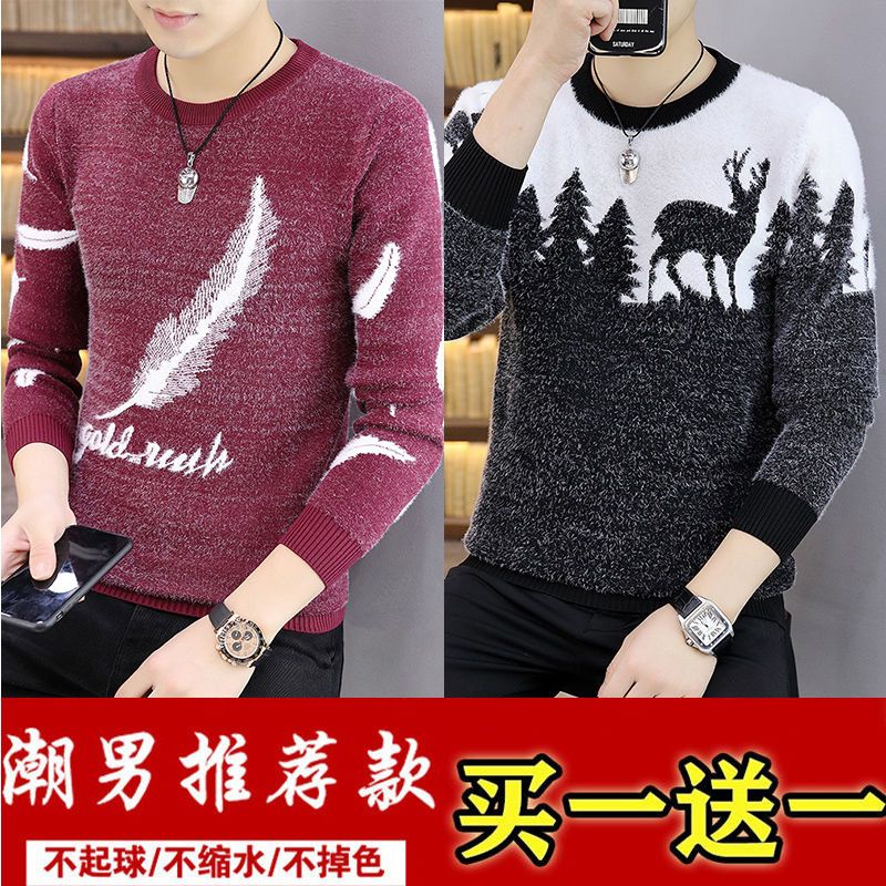 毛衣男加厚保暖秋冬新款青少年保暖潮流圆领毛衣男装针织衫1/2选 L105-120斤 毛衣-羽毛红+小鹿黑【两件装】