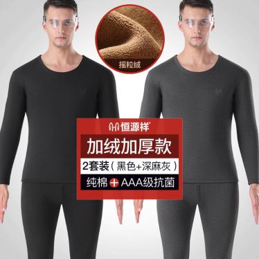 恒源祥男士保暖内衣套装纯棉毛衫全棉冬季加绒加厚打底秋衣裤秋裤 圆领黑色+深麻灰 165 M