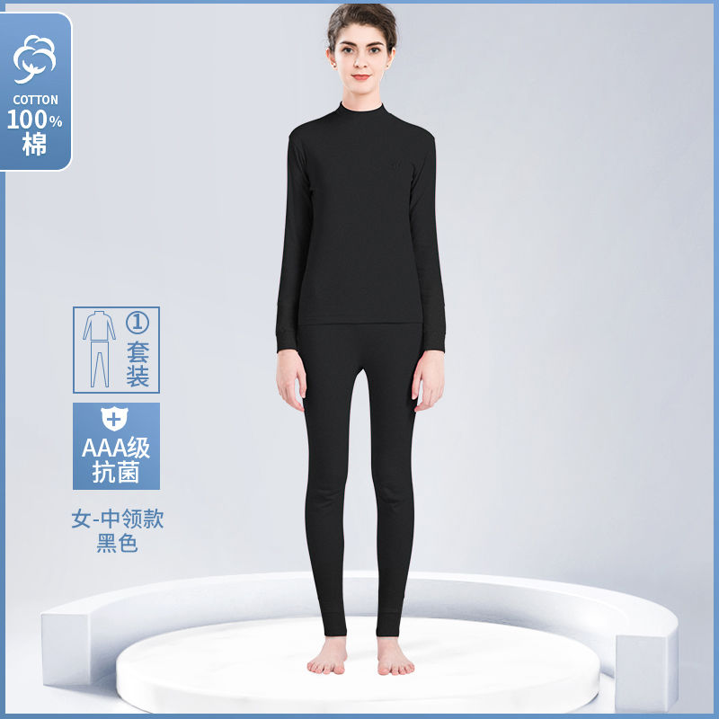 恒源祥100%纯棉男士保暖内衣薄款套装秋衣秋裤中高领棉毛衫秋冬季_55_274 170/L 套装女中领棉质zlhs黑色