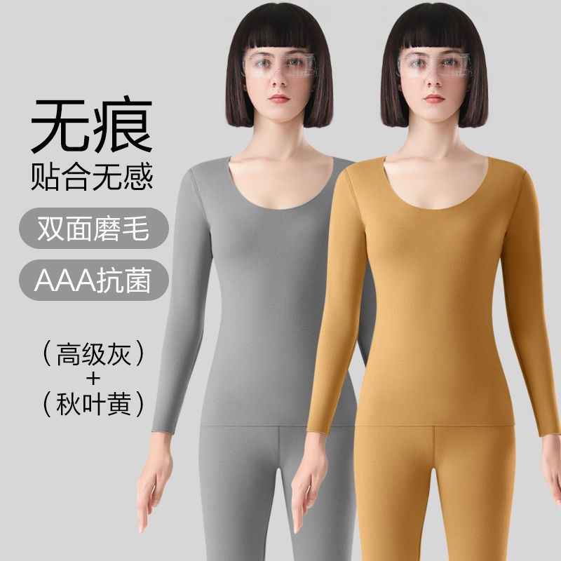 恒源祥薄款保暖内衣女士无痕轻薄紧身打底内穿秋衣秋裤套装秋冬季_71_844 170/95 2套-【双面磨毛】高级灰+秋叶黄