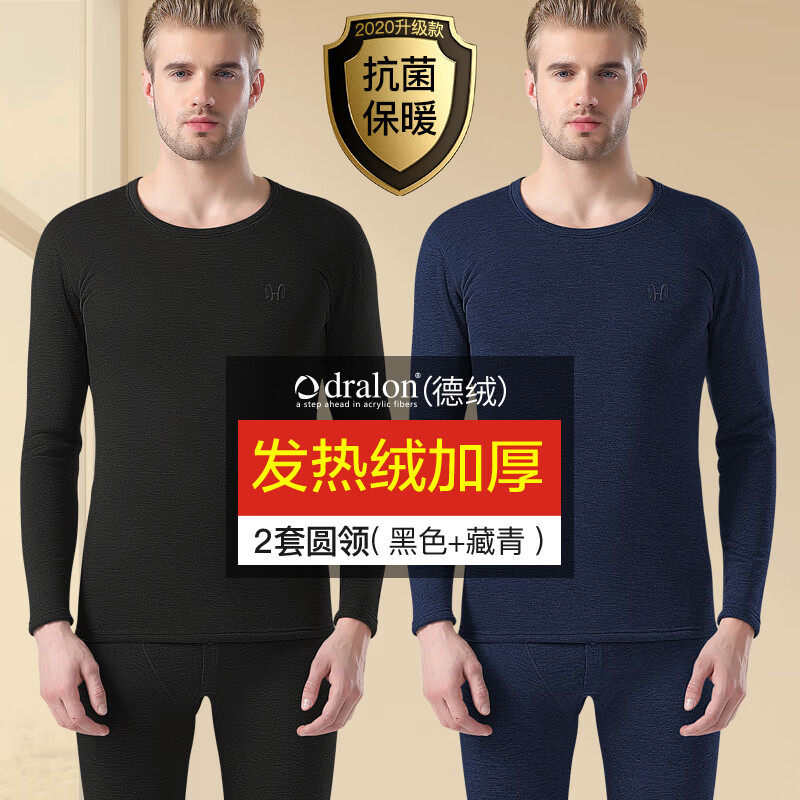 恒源祥男士套装加绒加厚德绒锁温保暖内衣纯棉秋冬季抗寒防风男款_494_164 190(4XL) 2套装圆领【德绒加厚】黑色+藏青