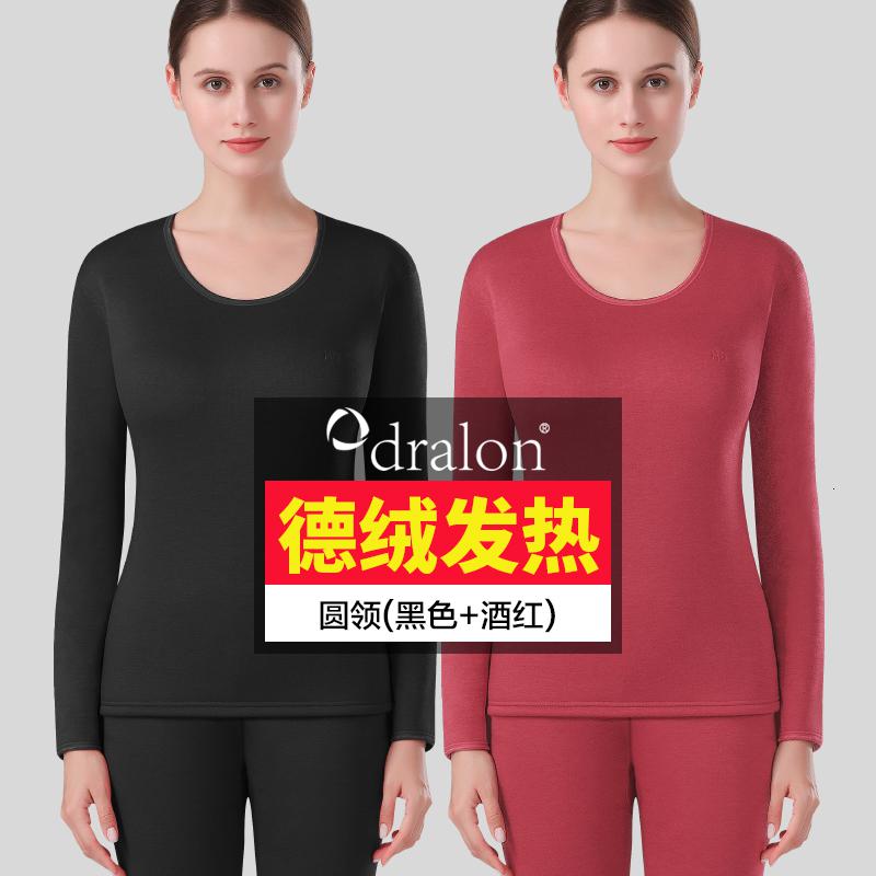 恒源祥保暖内衣女士德绒发热加绒加厚大码打底秋衣裤秋裤套装冬季_778_405 165/M【德绒加厚发热保暖】 【圆领】黑色+酒红