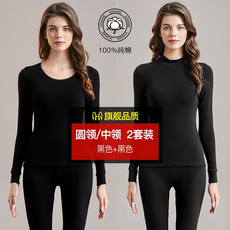 恒源祥女士内衣纯棉冬季薄款保暖内衣秋衣秋裤套装打底棉毛衫_438_279_835 S(160/85) 黑色圆领+黑色中领【纯棉抗菌】