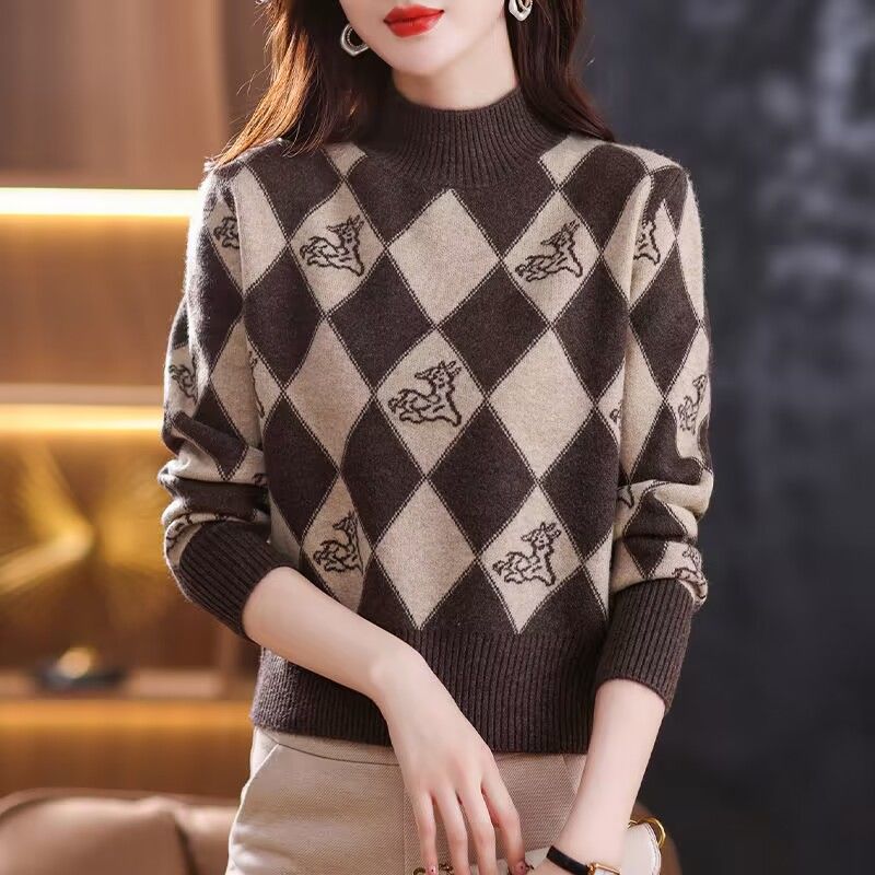 加绒加厚秋冬新款短款毛衣女小个子时尚菱格提花宽松针织打底上衣 S【80-100斤】 咖啡色