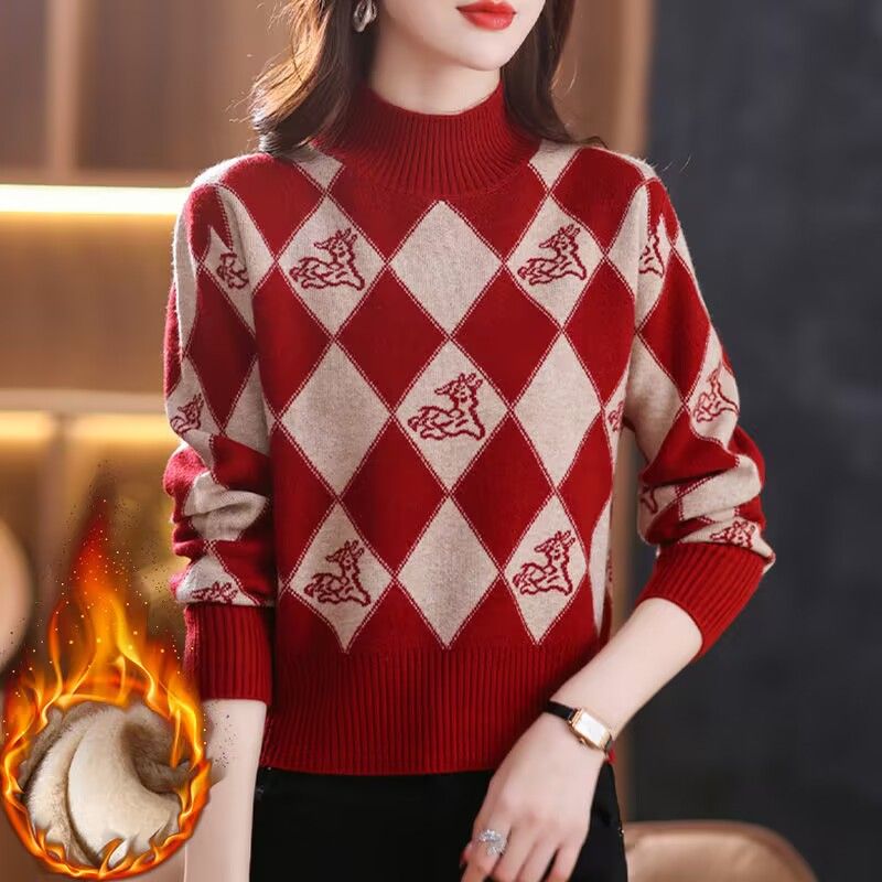 加绒加厚秋冬新款短款毛衣女小个子时尚菱格提花宽松针织打底上衣 L【110-120斤】 红色【加绒加厚】