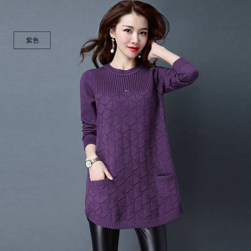 大码女装中长款圆领毛衣女秋冬加肥加大版宽松显瘦时尚针织打底衫 M建议98-110斤 紫色(口袋)