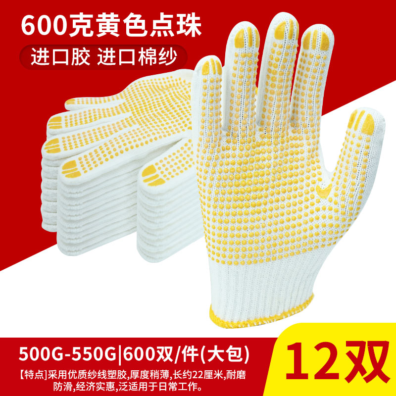 手套手套劳保工作耐磨点胶工地干活防滑线胶透气耐磨点珠棉线手套男女 600克黄色点珠12双 均码