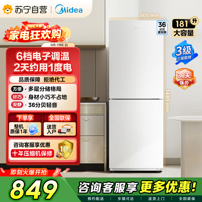 美的白色MR-190E三口之家高效节能双门冰箱181升大容量独立放置手动除霜低音设计