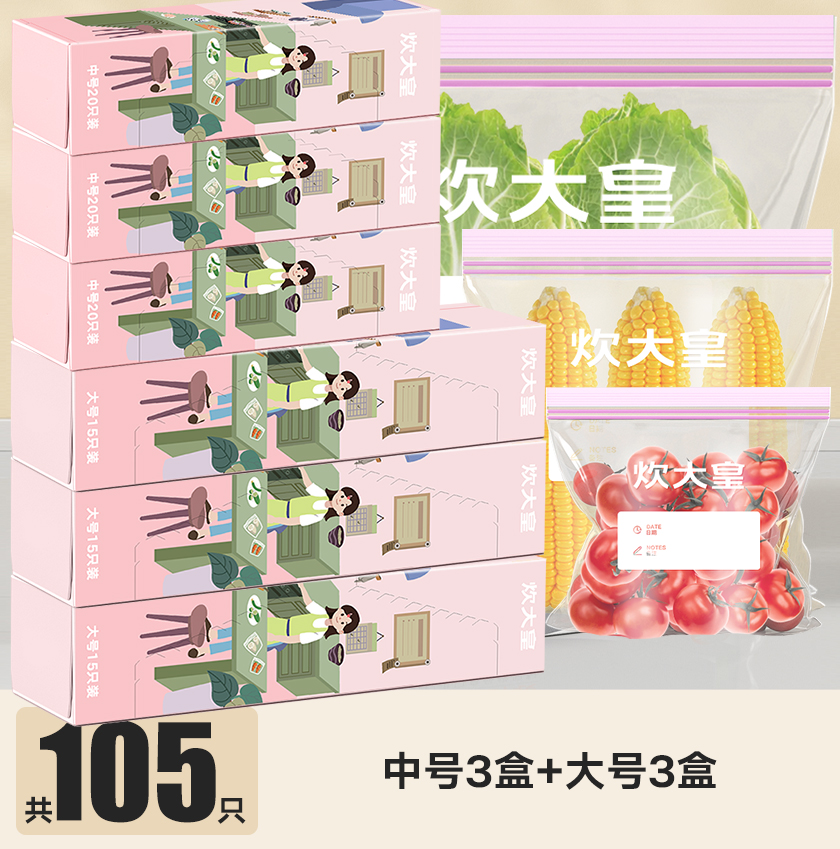 保鲜袋食品级家用密封袋子冰箱专用带封口塑自封袋厨房分装 加厚盒装3大3中