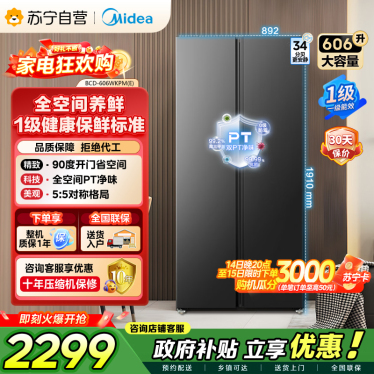 [自营]美的冰箱606L对开门智能双变频一级能效家用超薄电冰箱风冷无霜净味BCD-606WKPM(E)