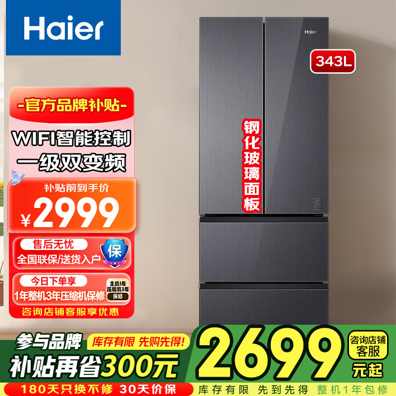 海尔(Haier)海尔343升法式多门一级能效双变频钢化玻璃彩晶面板风冷无霜四开门家用大容量电冰箱WiFi智控