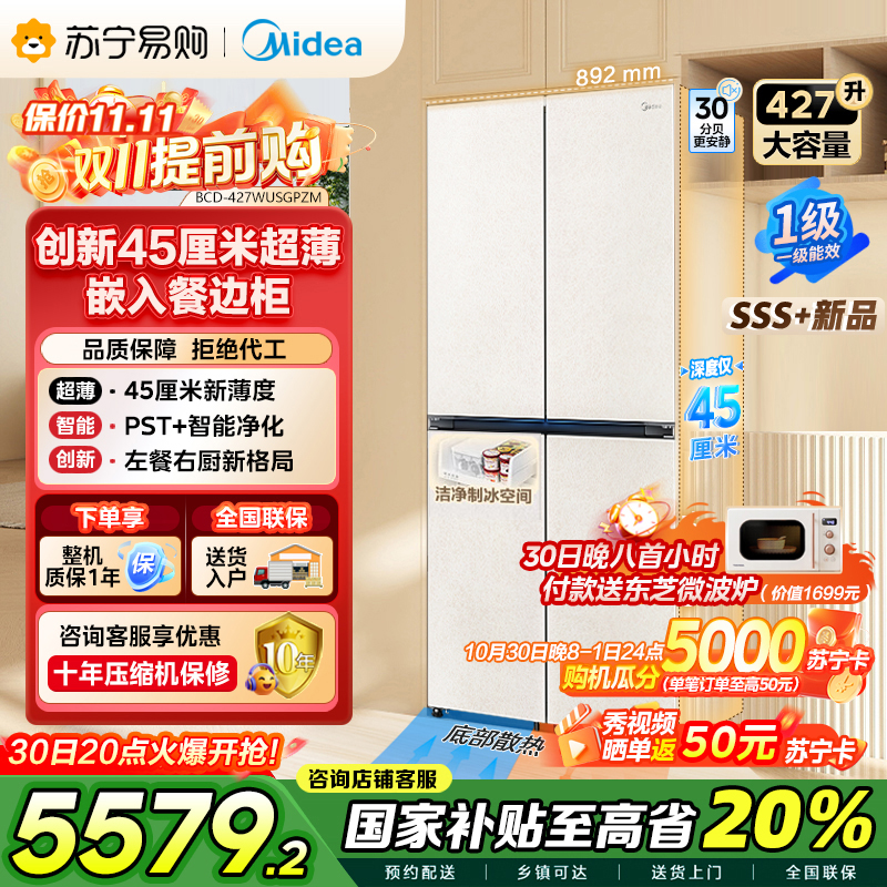 美的(Midea)首创45cm超薄嵌入餐边柜家用客厅冰箱左餐右厨大容量底部散热十字四开门国家补贴BCD-427WUSGP