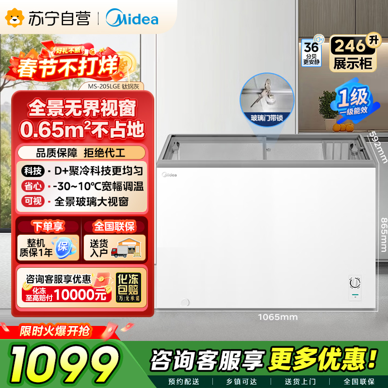 [自营]美的冰箱(Midea)展示柜冷藏保鲜柜卧式冰柜冷柜小型冰箱冷冻柜雪糕柜饮料水果柜一级能效MS-305LGE