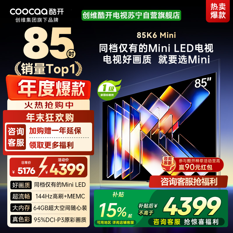 创维酷开电视K6 Mini 85英寸AI智能电视 4+64G大内存 144Hz高刷 一级能效以旧换新补贴 85P5F