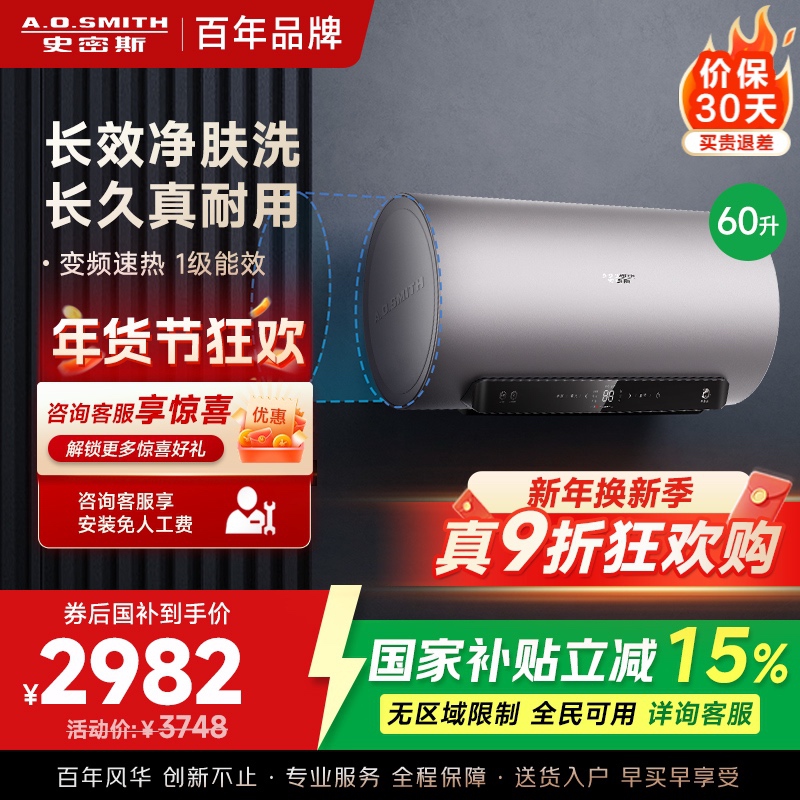 AO史密斯电热水器60升 短款 国家补贴 80吨长效净水洗 免清洗 3kW变频速热 金圭特护 E60ED6-B