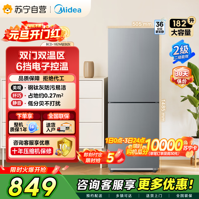 [自营]美的冰箱(Midea)182升双开门两门小户型家用租房宿舍可冷藏冷冻不占地低音运行BCD-182M钛钢灰-星烁