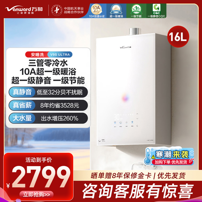 万和(Vanward)[安睡洗V9P PRO·纳米气泡洗]16升天然气燃气热水器 一级节能恒温机